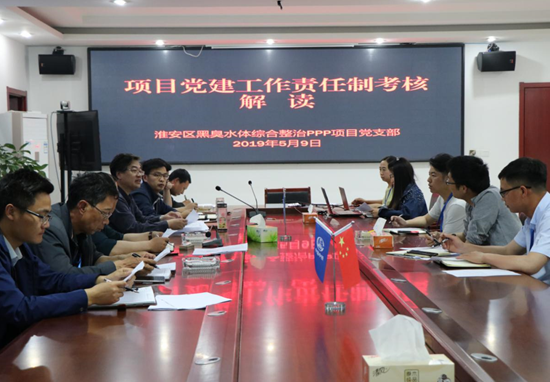 5月9日,淮安区黑臭水体综合整治PPP项目党支部解读“党 建工作责任制考核”,开启项目“周培训”第一课,项目党支部书记授课。