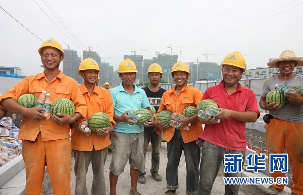 “各位工友快到我这里来,项目上给我们发西瓜和矿泉水了。”16日上午九点三十分,南京市栖霞区丁家庄保障房工地,中铁上海工程局市政公司南京丁家庄保障房项目现场,挥汗作业的几十...