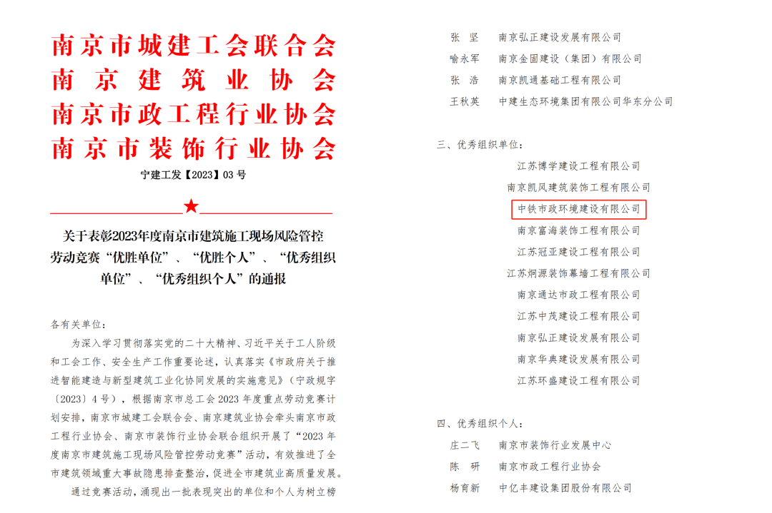 11月13日,2023年度南京市建筑施工现场风险管控劳动竞赛表彰名单公示,南京龙袍项目代表公司获得“优秀组织单位”表彰。...