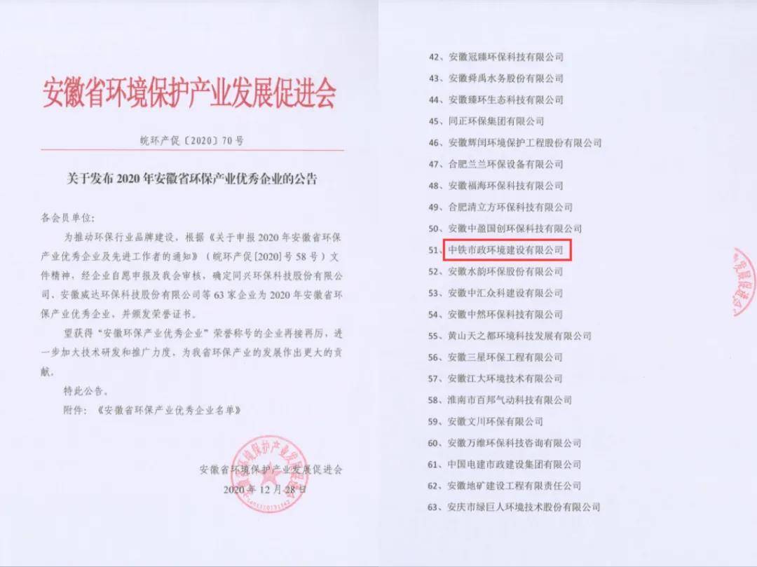 2020年12月,安徽省环境保护产业发展促进会发布“2020年安徽省环保产业优秀企业”公告、“2020年安徽省AAA级环保施工示范工地”通知及“2020年安徽省环保产业优秀企业及先进工作者”的公告。...