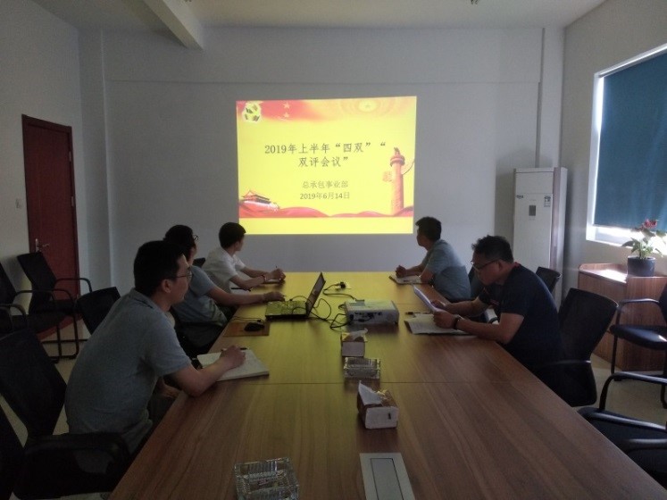 6月14日,总承包事业部党支部组织召开2019年上半年“四双”“双评”工作会议,事业部全体员工参会。(白勇龙)