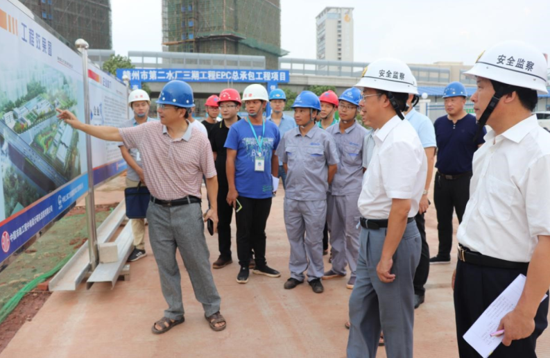 9月9日下午,赣州经济技术开发区管委会主任陈水连到公司承建的赣州第二水厂三期工程项目检查指导工作,赣州经开区住建局局长翁毅军、水务乐竞体育是靠谱吗副总经理陈俊陪同。陈水连深入施工现场,听取了项目工程概况、施工推进情况以及安全质量管控等详细汇报,重点查看了水厂的整体布局,以及水厂与客家大道交叉段控制性结构联络通道的施工进度。陈水连强调安全责任大于天,在施工过程中,项目部要严格落实安全管控措施,确保施工安全,树立良好的央企形象。同时要做到科学组织、务实求精、达标创优,确保水厂建设按期完成。