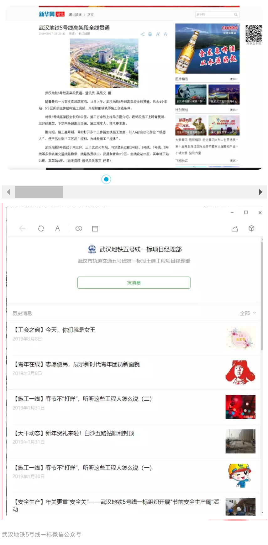 武汉地铁5号线一标项目党支部成立了由项目书记为组长的宣传工作领导小组,组织制定了项目宣传工作年度计划及奖惩办法。在《中铁上海工程》报投稿工作方面,每月制定宣传工作总结和下月工作计划,截至目前已在《中铁上海工程》报上刊稿6篇。在对外宣传工作方面,在重大节点、人才培养、企业文化等方面深入挖掘,此外,党支部还创办了“武汉地铁五号线一标项目经理部”微信公众订阅号,每日上传施工日报,并结合施工生产、党建工作及企业文化等方面情况,开辟了大干动态、党群园地、信息速递等栏目,第一时间推送微信信息,将微信公众号打造成了展示项目文化的“窗口”。