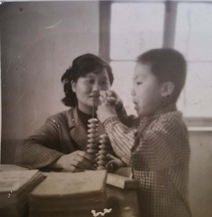在这张泛黄的老旧照片上,老师孙毅眼神充满关怀,手把手地教导着一年级的孔庆伟摆弄教具上的珠子。小朋友神情专注,微微张开的嘴巴似乎急切着想解开教具上谜题。
