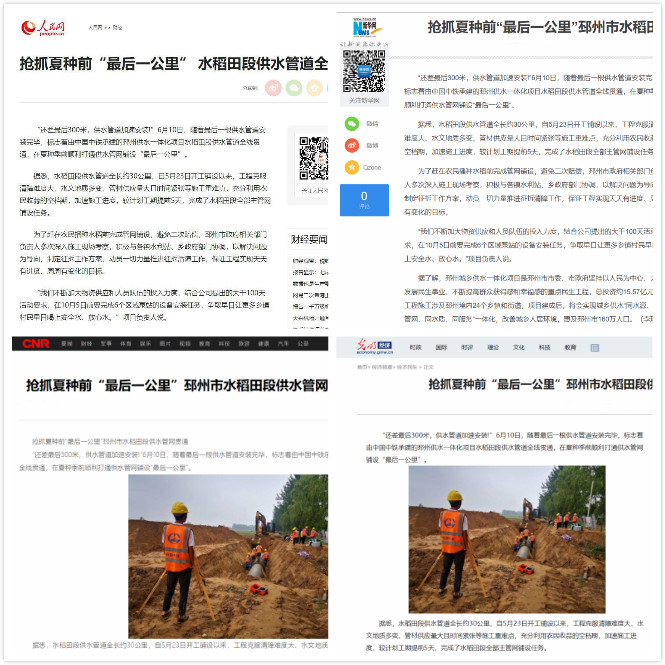 6月10日,由公司承建的邳州市供水一体化PPP项目水稻田段供水管道全线贯通。邳州市供水一体化PPP项目水稻田段供水管道全长约30公里,自5月23日开始铺设以来,项目部克服清障难度大、水文地质多变、管材供应量大且时间紧张等施工重难点,充分利用农民收蒜的空档期,加速施工进度,19天完成30公里主管网铺设任务,较计划工期提前5天。人民网、新华网、央广网、中国新闻网、光明网、中国网、江南时报、江苏视窗、徐州之窗等10余家中央级及省部级主流媒体对此进行了专题报道: