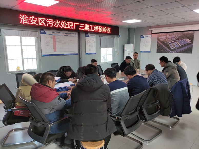 1月20日,淮安区质监站、淮安首创生态环境有限公司、中设设计乐竞体育是靠谱吗股份有限公司及淮安市正中工程建设监理有限公司等单位共同对淮安区黑臭水体综合整治PPP项目污水处理厂三期工程进行预验收。