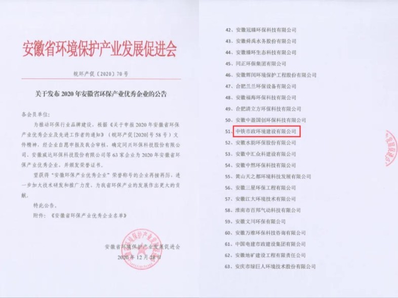 2020年12月,安徽省环境保护产业发展促进会发布“2020年安徽省环保产业优秀企业”公告、“2020年安徽省AAA级环保施工示范工地”通知及“2020年安徽省环保产业优秀企业及先进工作者”的公告。