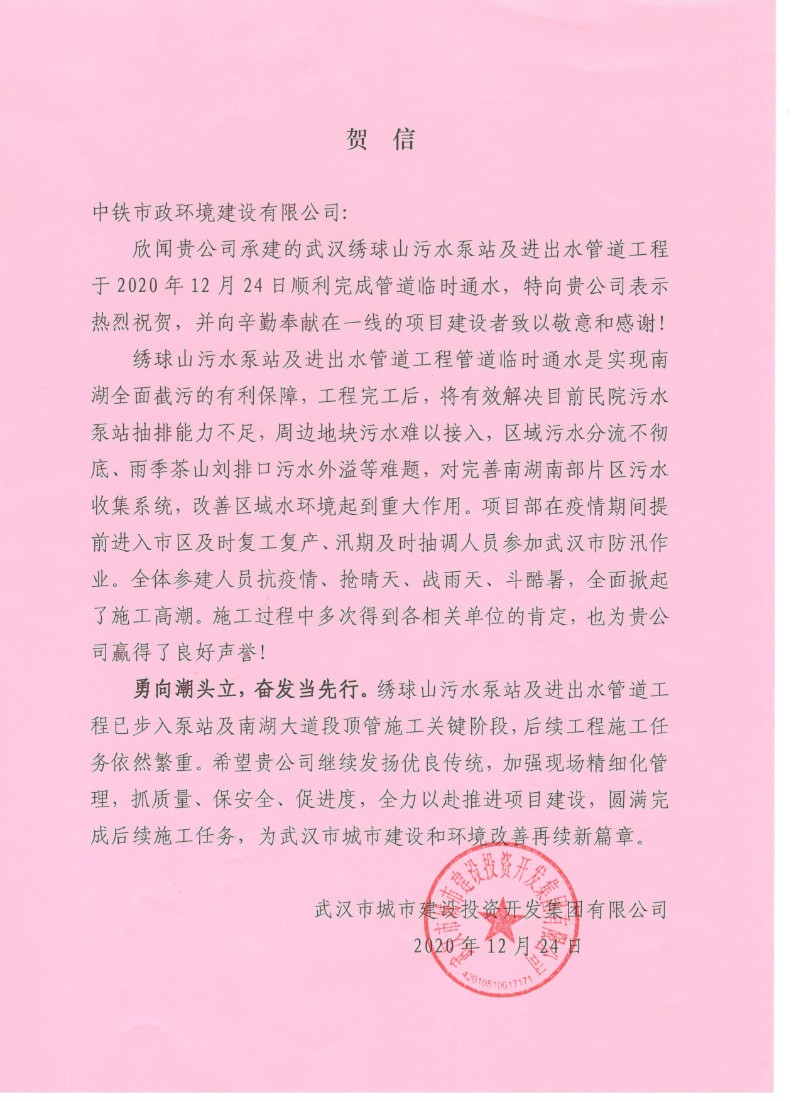 2020年12月24日,武汉绣球山污水泵站及进出水管道工程项目部顺利完成管道临时通水。自项目施工以来,全体参建人员抗疫情、抢晴天、战雨天、斗酷暑,全面掀起施工高潮,施工过程中多次得到各相关单位的肯定。工程完工后,南湖全面截污将得到有利保障,有效解决目前民院污水泵站抽排能力不足,周边地块污水难以接入,区域污水分流不彻底、雨季茶山刘排口污水外溢等难题,对完善片区污水收集系统、改善区域水环境起到重大作用。为此,武汉市城市建设投资开发乐竞体育是靠谱吗有限公司发来贺信。