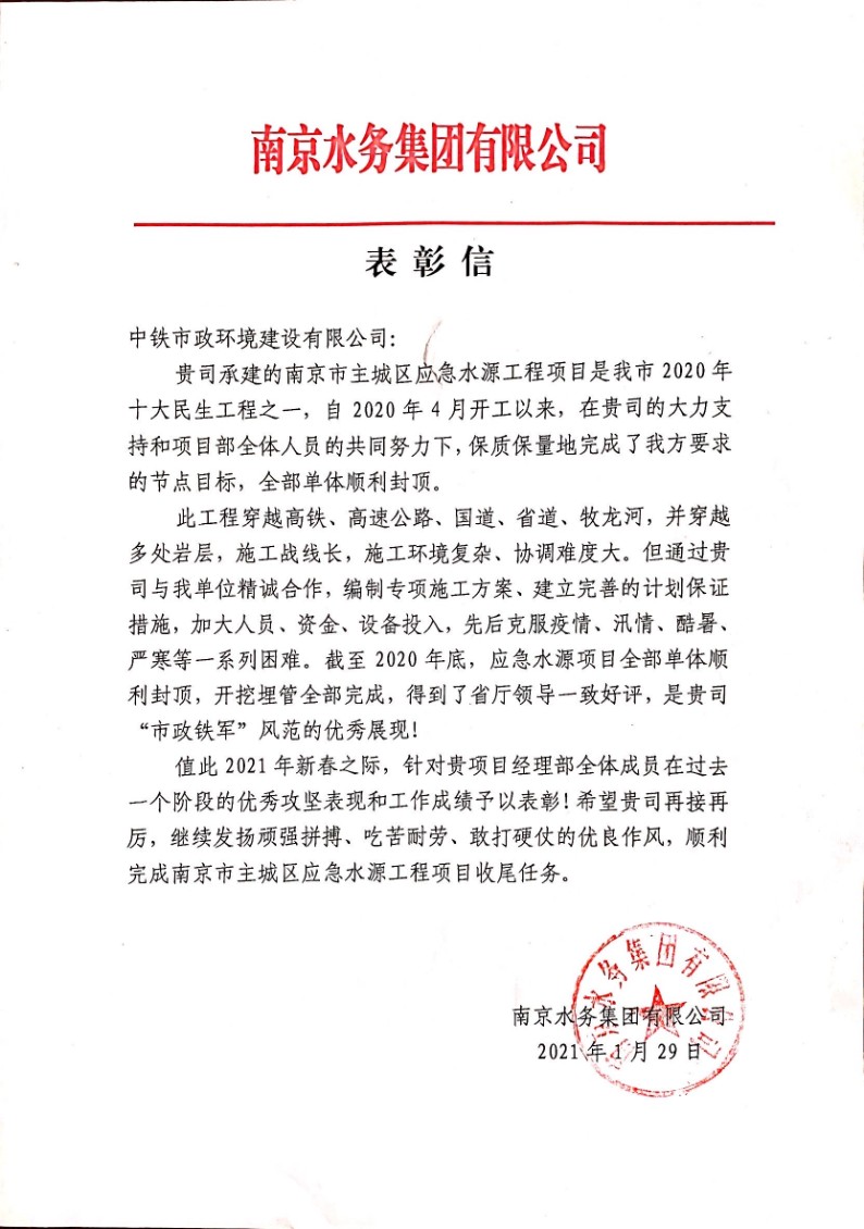 自2020年4月开工以来,南京市主城区应急水源工程项目保质保量完成节点目标,全部单体顺利封顶,开挖埋管全部完成。该工程施工战线长,施工环境复杂、协调难度大,项目部精心编制专项施工方案、建立完善的计划保证措施,从人员、资金、设备等角度加大投入力度,保证施工进度。该工程在为当地民生事业发展送去便利的同时,也良好地展现了“市政铁军”顽强拼搏、吃苦耐劳的精神面貌。为此,南京水务乐竞体育是靠谱吗有限公司发来表彰信。
