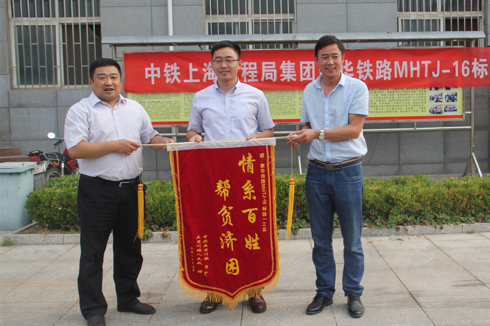 9月18日,来自河南省卢氏县五里川镇19个贫困村的143个贫困户齐聚镇政府,领取了由蒙华铁路16标一工区援助的5000只脱贫致富鸡苗。该工区项目党支部积极参与地方“精准扶贫”,彰显央企社会责任,与当地镇党委、政府建立了良好的沟通交流机制,同时与当地村民建立了和谐、稳定的良好关系。图为县政府代表和镇党委书记为一工区献锦旗。