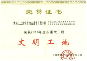 近日,从上海市重大工程建设办公室传来佳讯,由公司承建的上海黄浦江上游水源地连通管工程C5标项目荣获上海市“2016年度重大工程文明工地”称号,为公司再添荣誉。