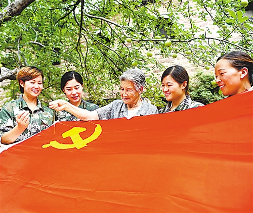 6月30日,中国历史文化名村河北省沙河市王硇村开展“同心共筑中国梦 红色基因永传承”主题活动,一位60年党龄的老党员带领女子民兵班的民兵,一针一线将中国共产党党徽绣在鲜艳的红旗上,以表达对党的无限热爱、对祖国的美好祝福。赵永辉摄